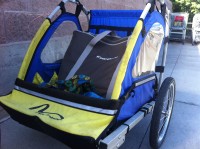 Why buy a bike trailer when you can build your own? Basically, they are just a box with two wheels and a tow bar. I’ve built two. The first was a flat bed, using 1/2 inch plywood for a base, a 5/8 inch steel axle, a couple of $4 handcart tires from Harbor Freight and a top rail left over from fixing a chain link fence for the tow bar. The trailer hitch was home made also. A swivel air chuck for the attachment point. Weighed a ton, but sturdy as hell. I have carried a 20 lb propane tank, all my gold panning tools and a whole roll of insulation (one at a time) using eye hooks at the corners and bungle cords (God’s gift to cyclists). $20 total.