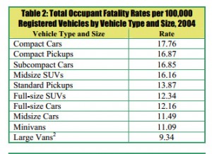 Thanks for making this comment. I was looking through the comments to see if someone would talk about this. The other side of the car crash by type statistics the MMM used is the fatality rate that is caused by a type of vehicle. So if I were an Anti-Mustachian who chose to drive a Tahoe and I was unfortunate enough to be involved in a collision with a compact car, I am much more likely to CAUSE a fatality to the occupants of the smaller car even if my risk of dying is slightly reduced.