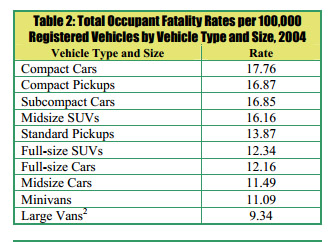 The measurement is a little different, since this chart compares fatalities per 100,000 vehicles instead of per mile. But we can still reasonably estimate that my subcompact car is about 16.85/12.34 =  37% more dangerous than a full-size SUV. (also note that midsize cars are safer than SUVs of any type, further proving that the S is for Sucka).