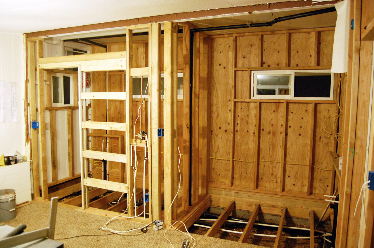 • Keeping an open mind to optimizing your design as you build can save money and time. For example, the unusual wall structure prevented plumbing pipes from coming up in exterior walls. It would have been a major problem for the plumber, and possibly caused a failed inspection. But we created bumped-out sections behind the cabinets to hold the pipes, which will have the side benefit of a larger countertop space. Similar ideas allow you to fit more free and reused materials into your project, and end up with fewer scraps to dispose of at the end.