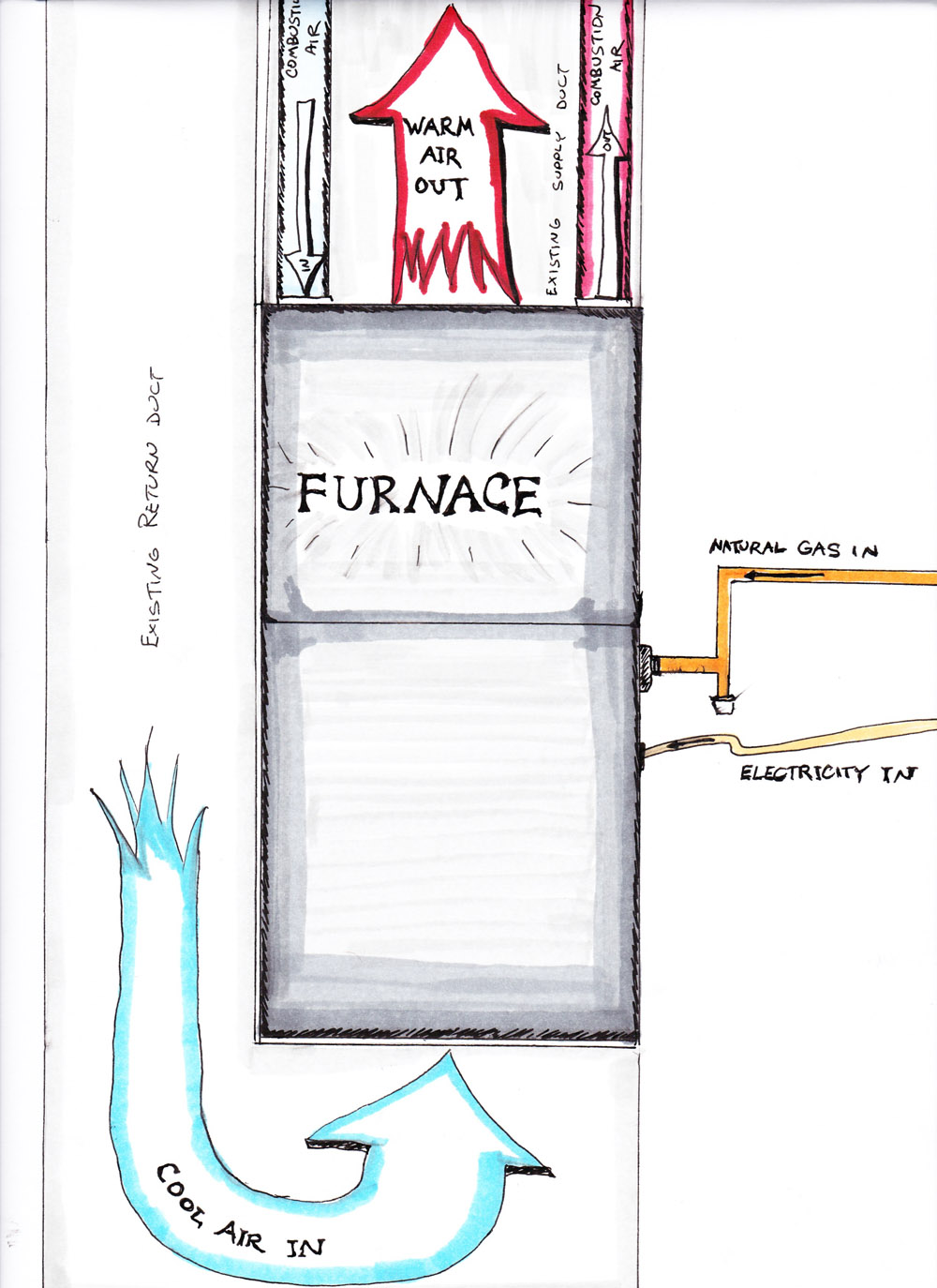 When you get right down to it, a gas furnace is just a box-shaped heater connected to some tubes. These days, they have added more internal complexity to make them more efficient, but all you really need to know as the installer is this: Cold Air in, Warm air out, Gas and Electricity in, Combustion air In and Out. It gets even easier if you write these same things on a picture of a box (aka furnace).