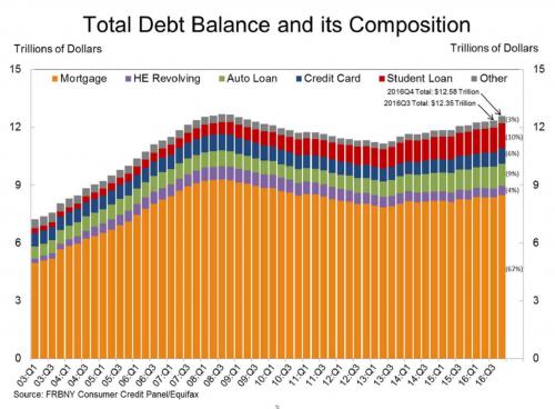 Household debt levels have risen back to their pre-crash peak, and with an even worse composition: more student loans, and a record level of auto loans, the most ridiculous and self-destructive piece of personal finance outside of mortgaging your shins to a loan shark to afford tonight’s cocaine.
