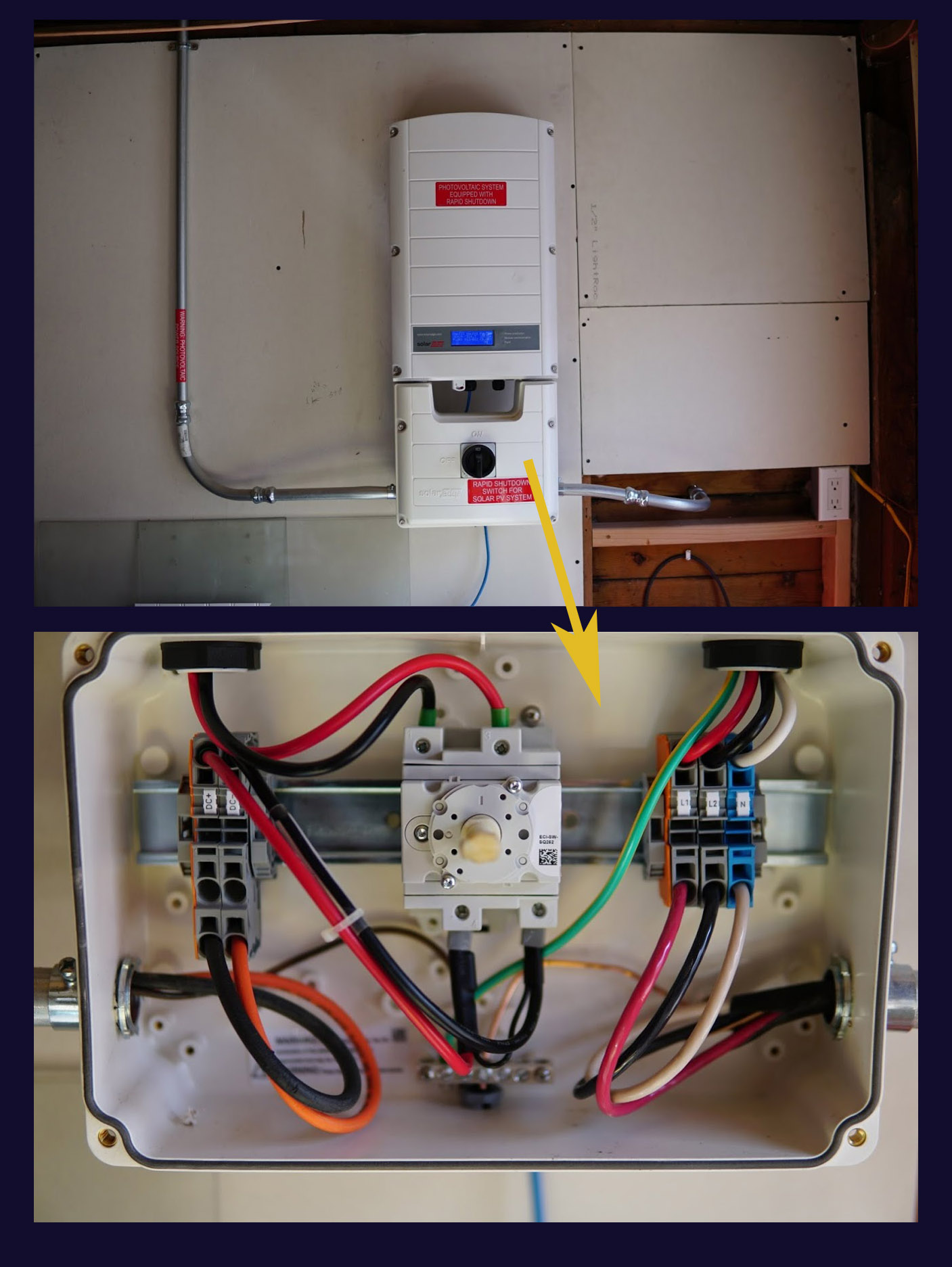 Inverter mounting, including the conduit going up through the roof (left), out to the main breaker box (right), required warning stickers (red), and how it’s hooked up inside (bottom)