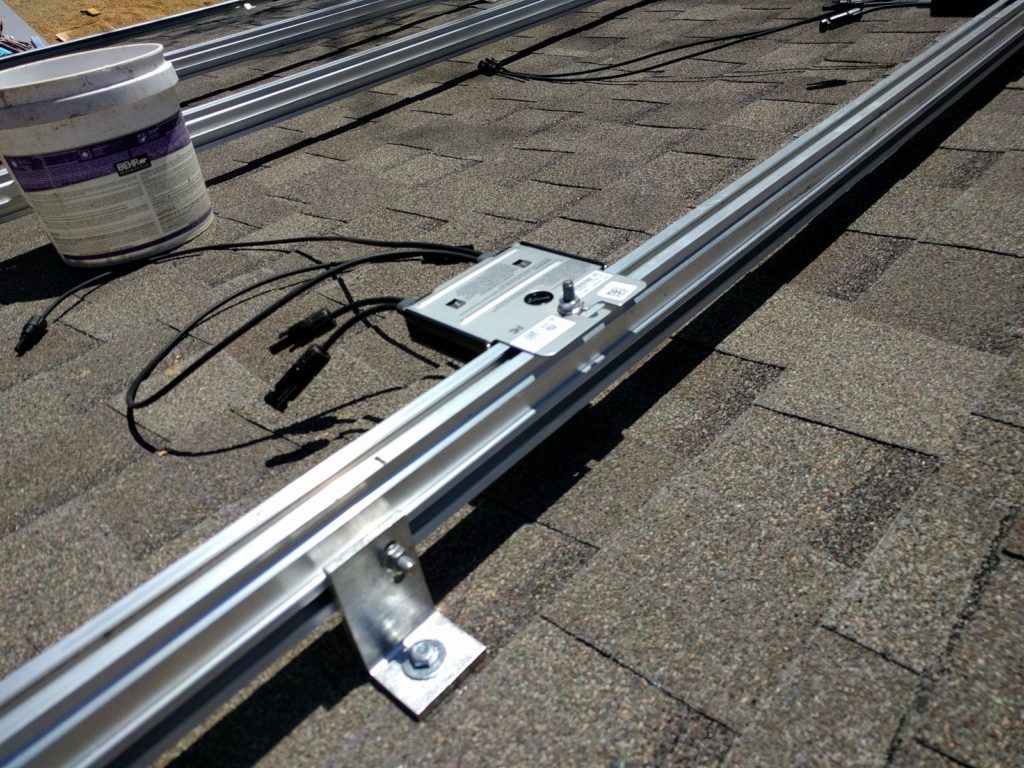 Optimizer mounting (face down), plus a good shot of the connections between roof, brackets, and rails. Note – a solar installer saw this and said he suggests you use flashings like this for extra protection on those L-feet.