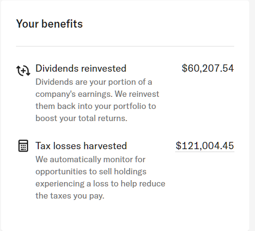 Betterment has harvested a surprising $121,004 in deductible “losses” on an account with about $466k of taxable money in it.
